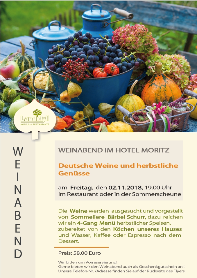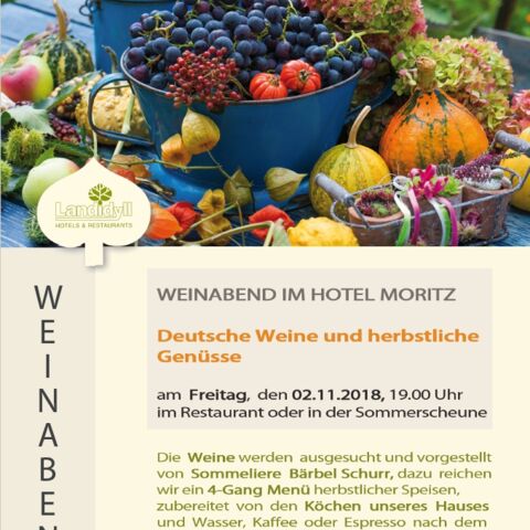 Die Weine werden von Frau Schurr ausgewählt und vorgestellt und zusätzlich bereiten Ihnen unsere Köche ein korresponidierendes 4-Gang-Menü aus der herbstlichen Küche zu. Dazu reichen wir Ihnen Wasser, Kaffee und Espresso nach dem Dessert.