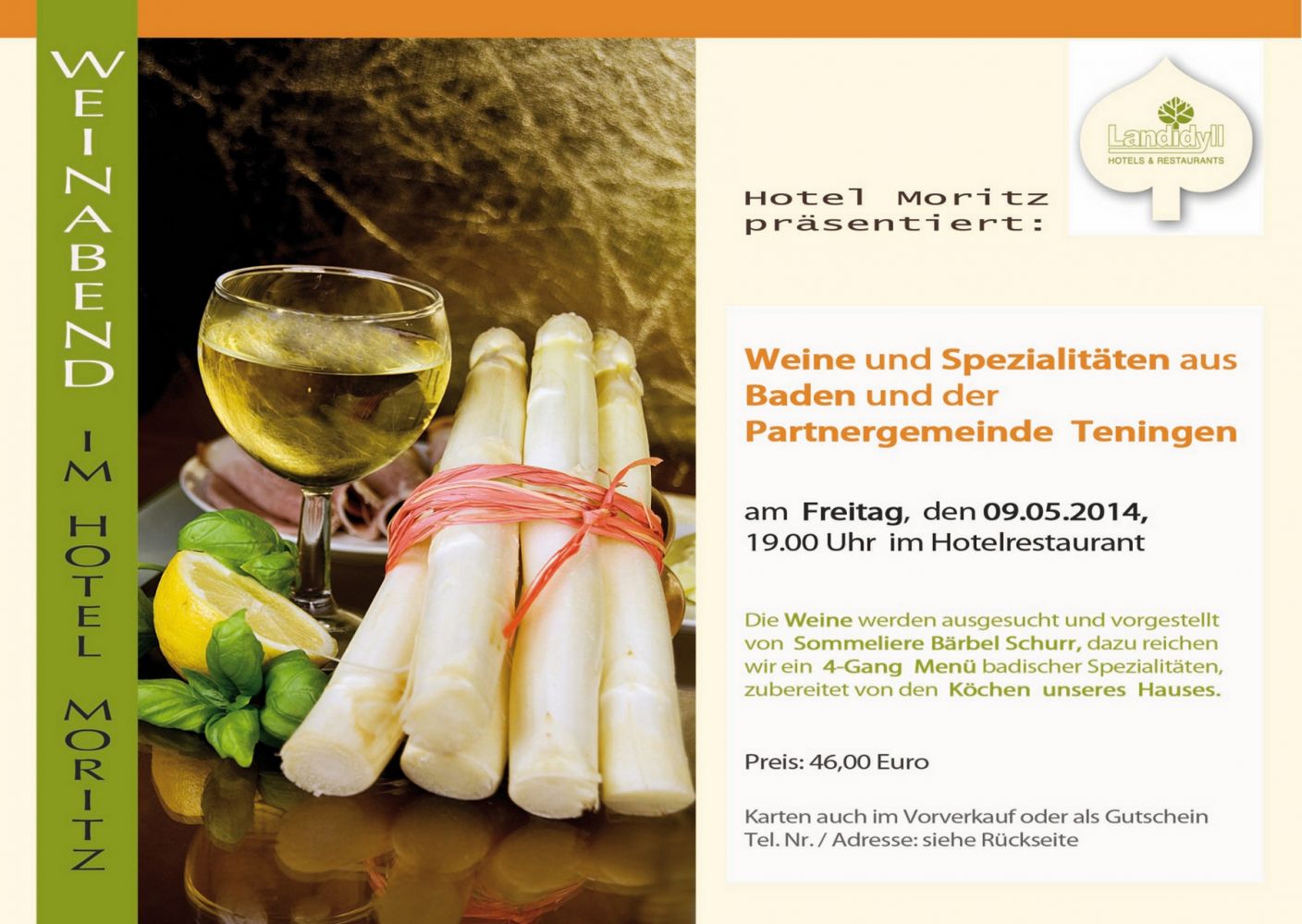 Auch dieses Jahr veranstalten wir wieder unseren alljährlichen Weinabend. Durch den Abend begleiten Sie unsere Freundin, Sommeliere und ehemalige Weinkönigin Bärbel Schurr, Moderator Thomas Großmann, unser Service- und Küchenteam und wollen Ihnen die Weine und kulinarischen Spezialitäten aus einigen Ecken Deutschlands ein Stück näher bringen.